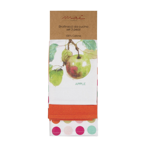 Set composto da 3 strofinacci nel formato 50x70 in cotone cooordinati tra loro, di cui 2 stampati e 1 a nido dape a tinta unita.