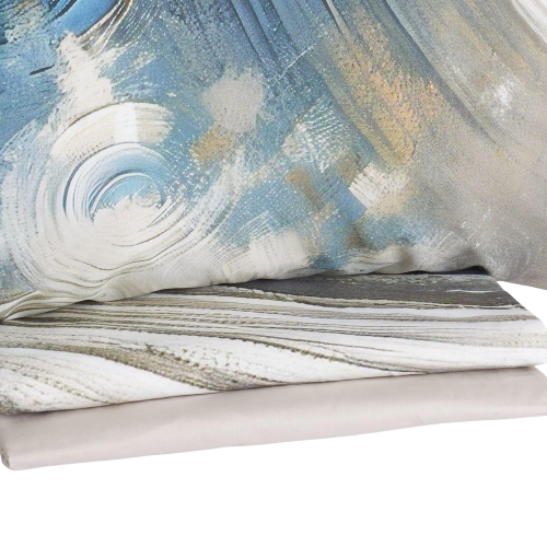 Il lenzuolo sopra č in fantasia stampata in digitale e balza copriletto in tinta unita, il sotto con angoli č in tinta unita come la balza, e le due federe sono double face da un lato in fantasia come il sopra e dallaltro in tinta unita come il sotto.