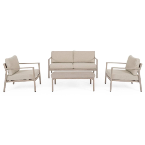 Realizzato in alluminio verniciato a polvere con effetto legno, questo set è dotato di cuscini per seduta e schienale sfoderabili in tessuto Spunpoly idrorepellente.